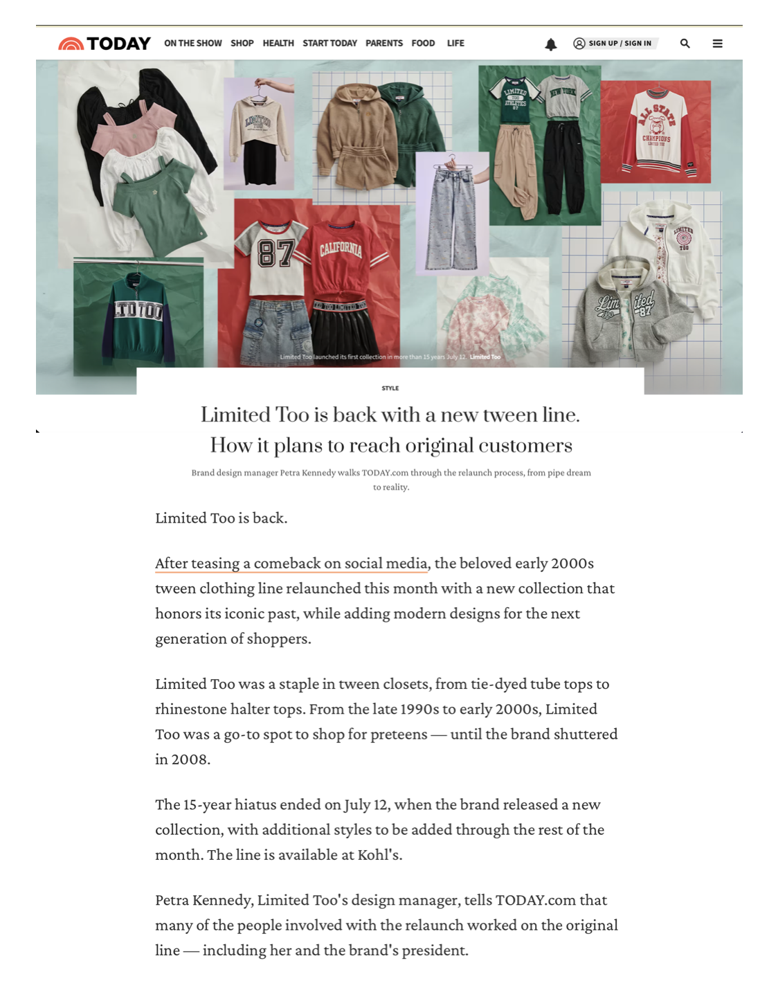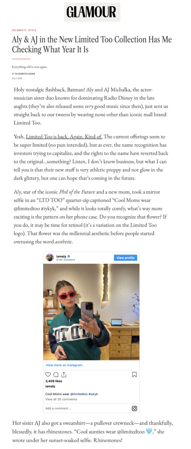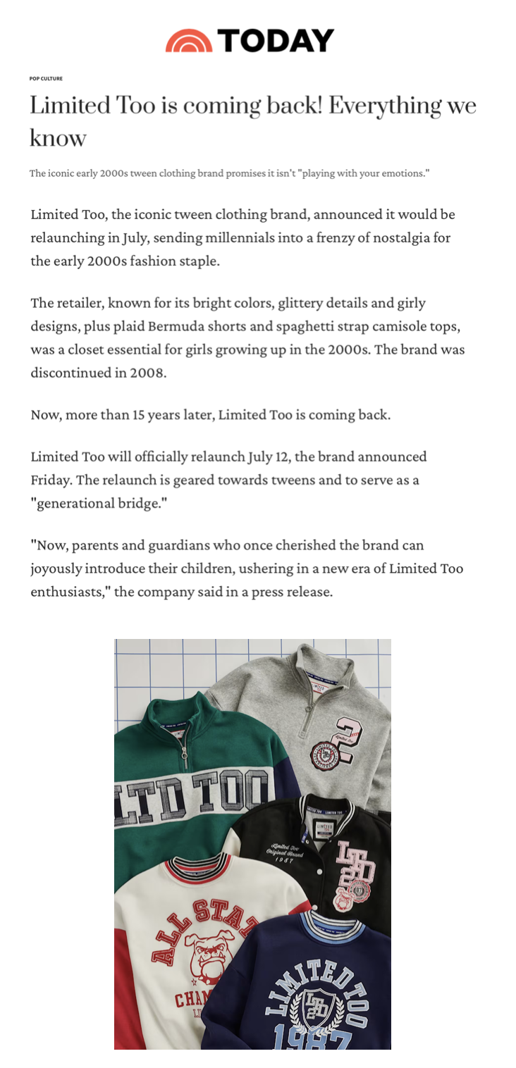 Limited Too re-entered the market in October 2024 with Limited Too 2.0, a curated digital launch designed to reintroduce the brand to a new generation.