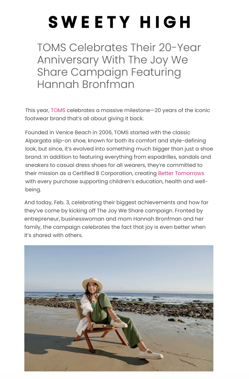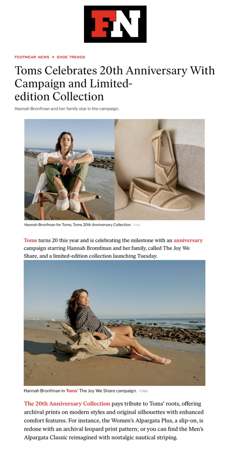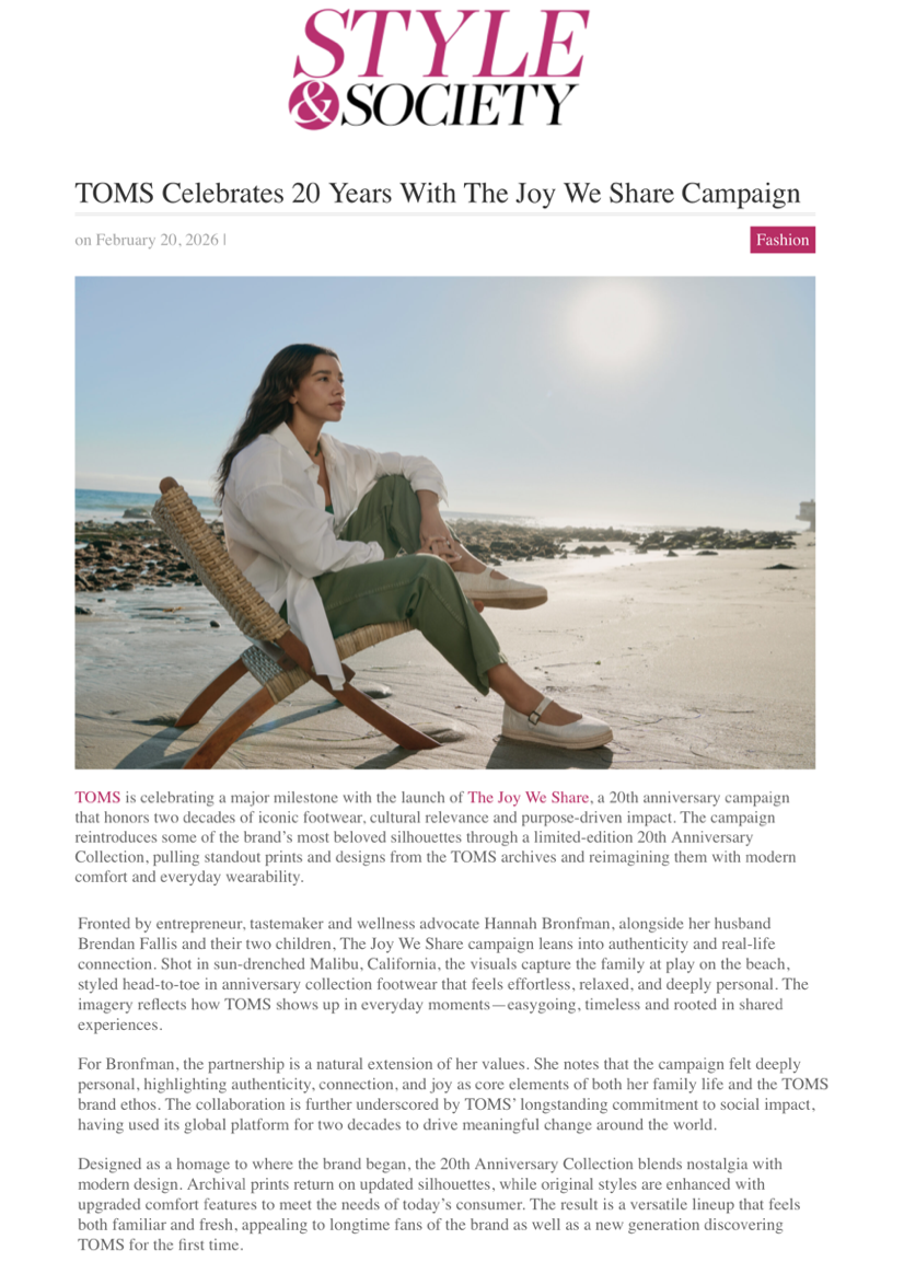 TOMS marked its 20th anniversary with The Joy We Share, using the milestone to bring its most recognizable product back into focus.